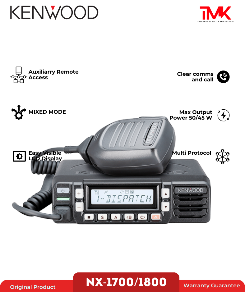 PERFORMA SUARA, PENGOPERASIAN LANCAR Meniru seri NX-3000 dan NX-5000 yang terkemuka, radio mobile NX-1700/1800 mendukung berbagai protokol termasuk NXDN dan DMR serta pengoperasian analog digital & FM campuran. Karena dilengkapi dengan semua fitur penting untuk memaksimalkan CAI digital ini, jelas memenuhi syarat sebagai solusi hemat biaya untuk berbagai aplikasi penting perusahaan dan operasional. Radio ini juga dilengkapi dengan kualitas audio TX/RX yang dapat dioptimalkan, dan panel depan cerdas yang memprioritaskan kemudahan kenyamanan: status operasional jelas terlihat sekilas dari layar LCD backlit putih dan indikator LED 7 warna.